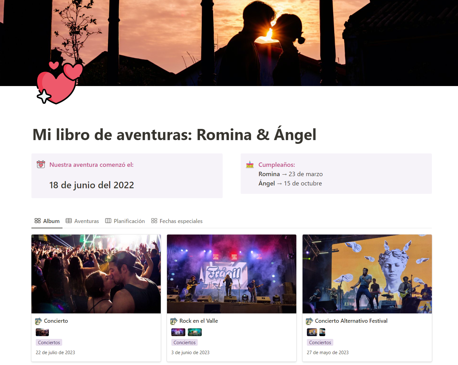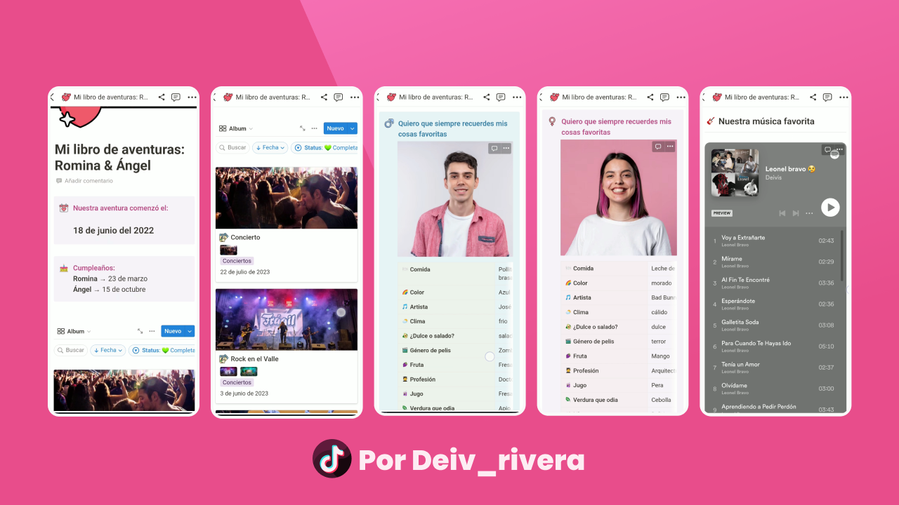 Y la mejor de todas ¡Notion! La app en la que podrán crear su propio libro de aventuras. Pueden planificar todo lo que les gustaría hacer y registrarlo con fotos para guardar un bonito recuerdo, además podrán organizar cada aventura, como paseos, viajes, conciertos, todo lo que quieran.