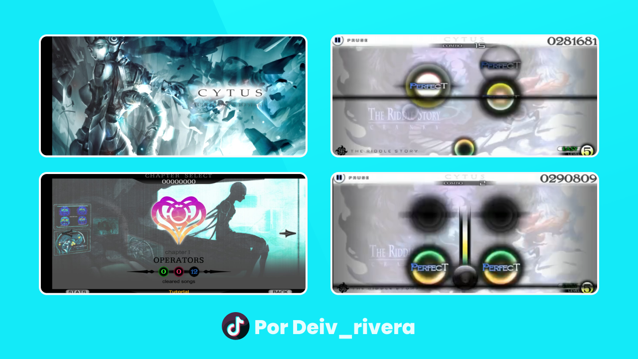 Este es uno de mis Juegos de música favoritos (desde hace 6 años). Cytus es juego de música en el que pondrás a prueba la velocidad tus dedos y tu visión, deberás presionar los círculos que salen en la pantalla al ritmo de la música y es todo un placer presionarlos al compás de las canciones.