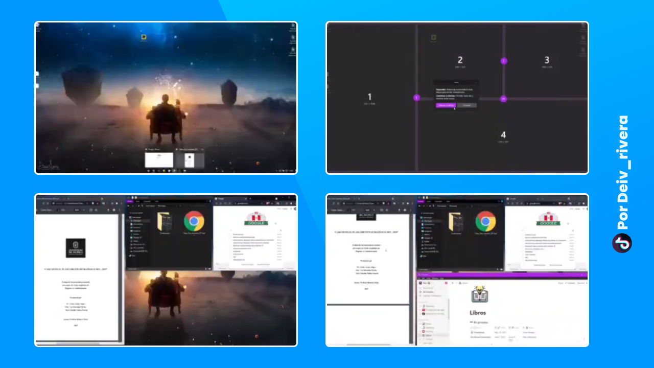 Imagina que quieras ver al mismo tiempo varias ventanas de programas, quizás quieras ver 3, 4 o 5 ventanas al mismo tiempo, acomodar manualmente las ventanas una por una es poco productivo, así que para eso existe Power Toys con su función de Fancy Zones que te permite acomodar las ventanas de tus aplicaciones como más te guste. Mira en la imagen como puedo acomodar mis ventanas en la posición que yo quiera.