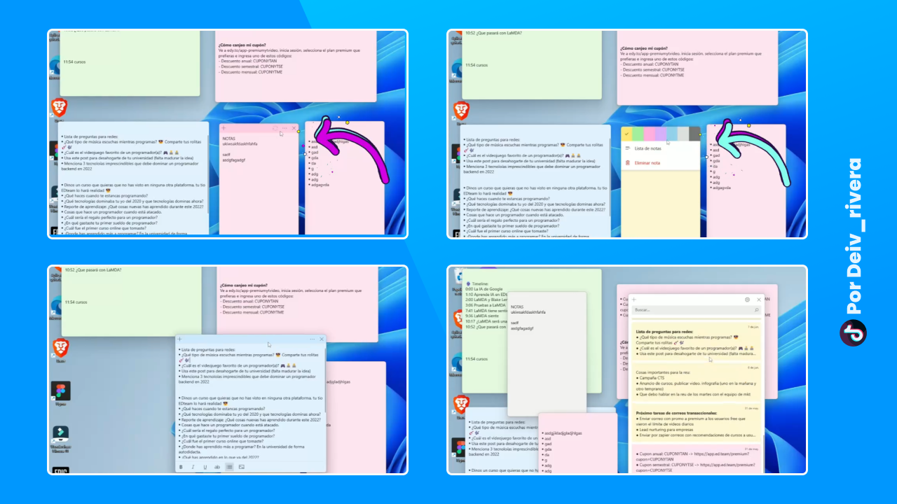 Una forma rápida de tomar notas es anotarlo en un post-it. Por lo general, cuando ingresas a las oficinas observas un montón de papelitos de colores pegados en la pared, escritorios, mesas, pizarras, donde sea. Las personas suelen realizar esto para recordar cosas, pero ahora que usamos más la PC reemplazarás tus post-it por Sticky Notes, que nos siver para hacer notas rápidas de cualquier cosa, puedes personalizarlas con los colores que más te gusten, arrastrarlas al lugar que quieras y lo tendrás todo organizado en tu pantalla.