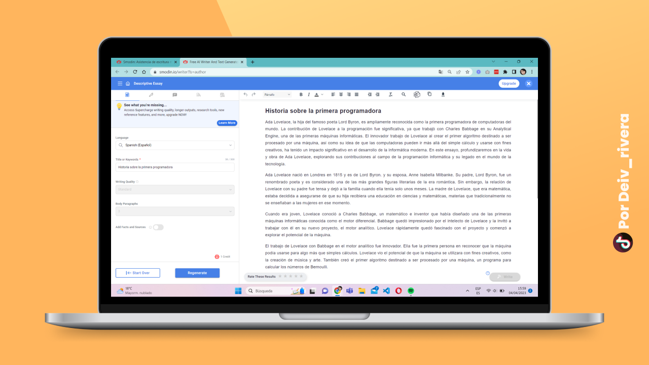 Te muestro un ejemplo de ensayo que realiza. Solo necesitas 5 palabras claves para que se genere automáticamente, recuerda que debes ser lo más exacto y concreto de lo que necesitas. Yo lo hice con la historia de la primera programadora. Como te muestro en la imagen de abajo, ingrese mis palabras clave y le di clic en Escribir Mi Ensayo.