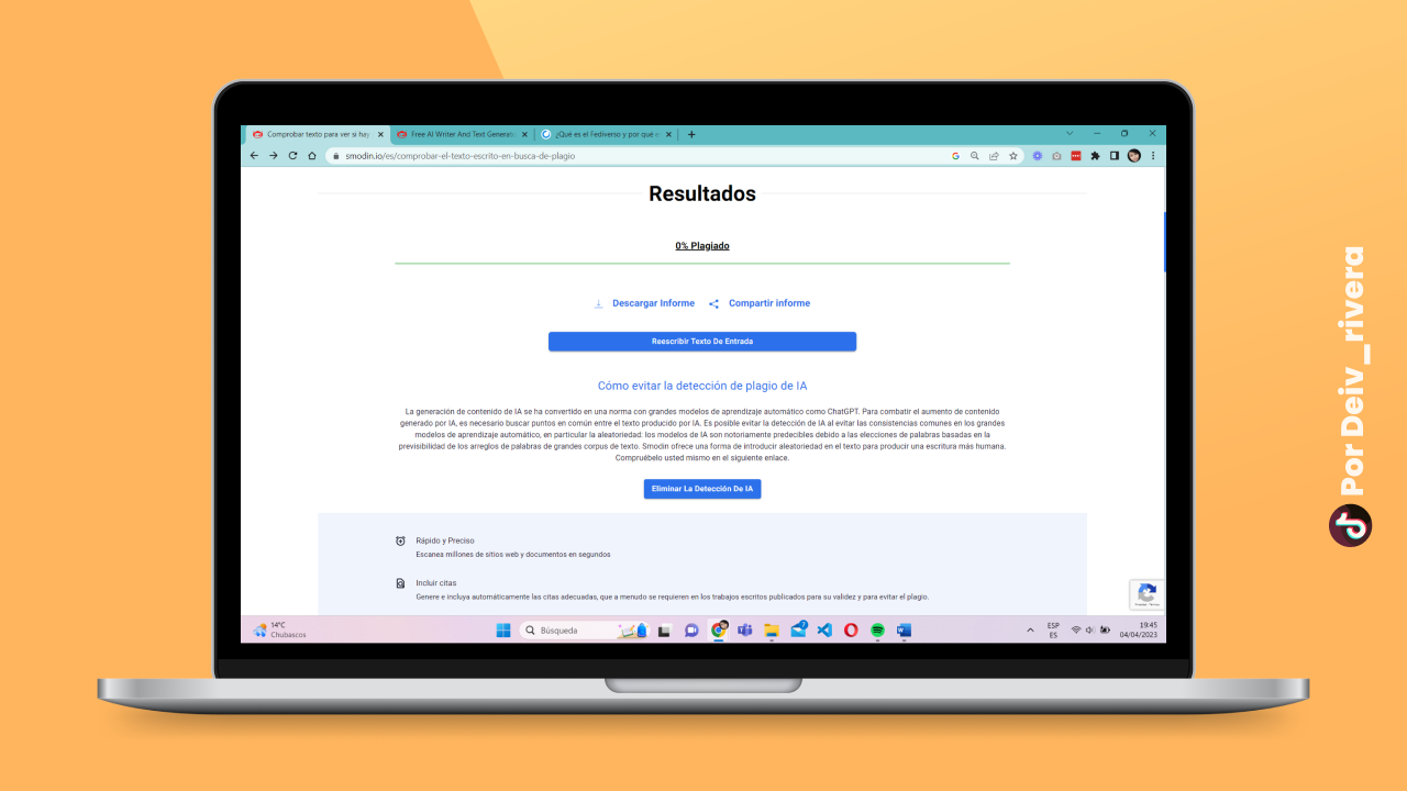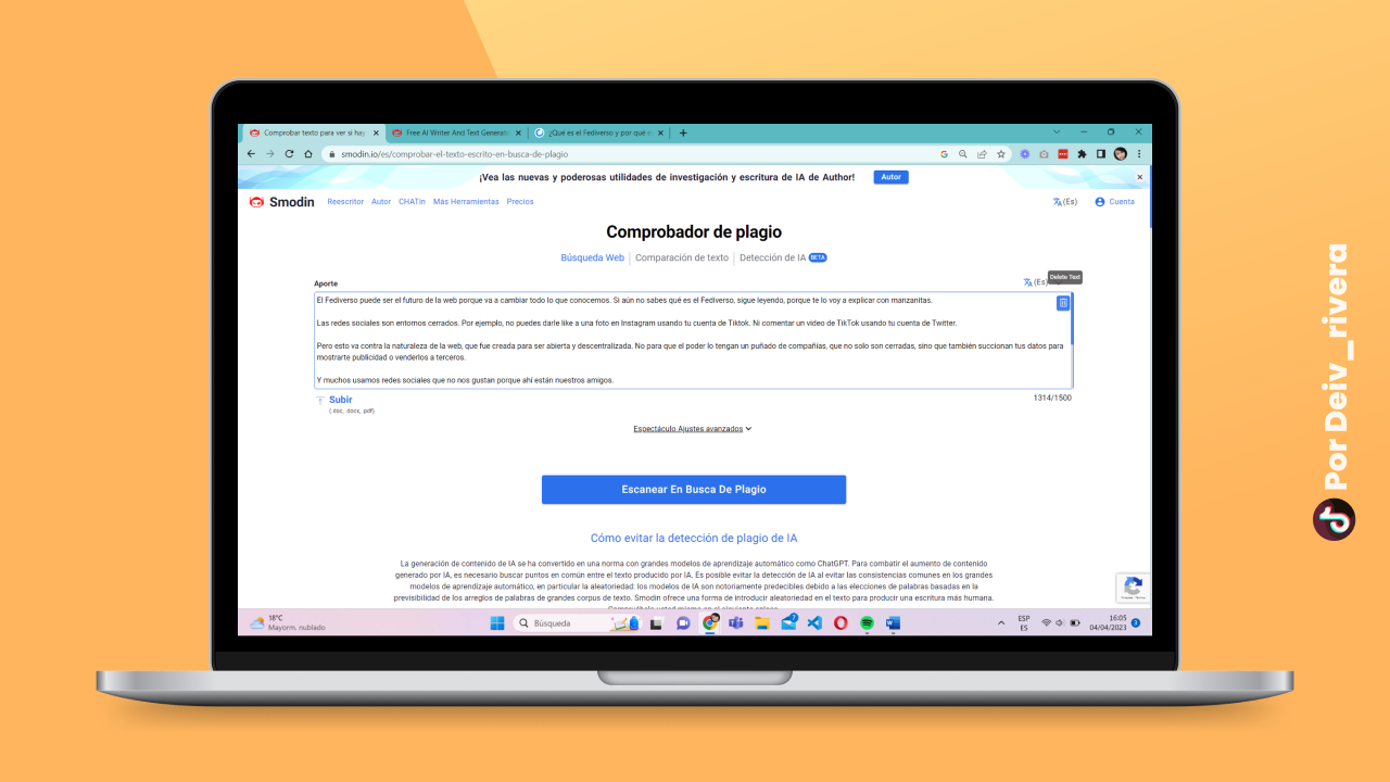 Si tu profesor te amenazo diciendo que va a revisar el porcentaje de plagio de tu tarea y tú quieres sacar un 0%, puedes comprobarlo con Smodin. Solo pegas el texto y de las a Escanear En Busca De Plagio.